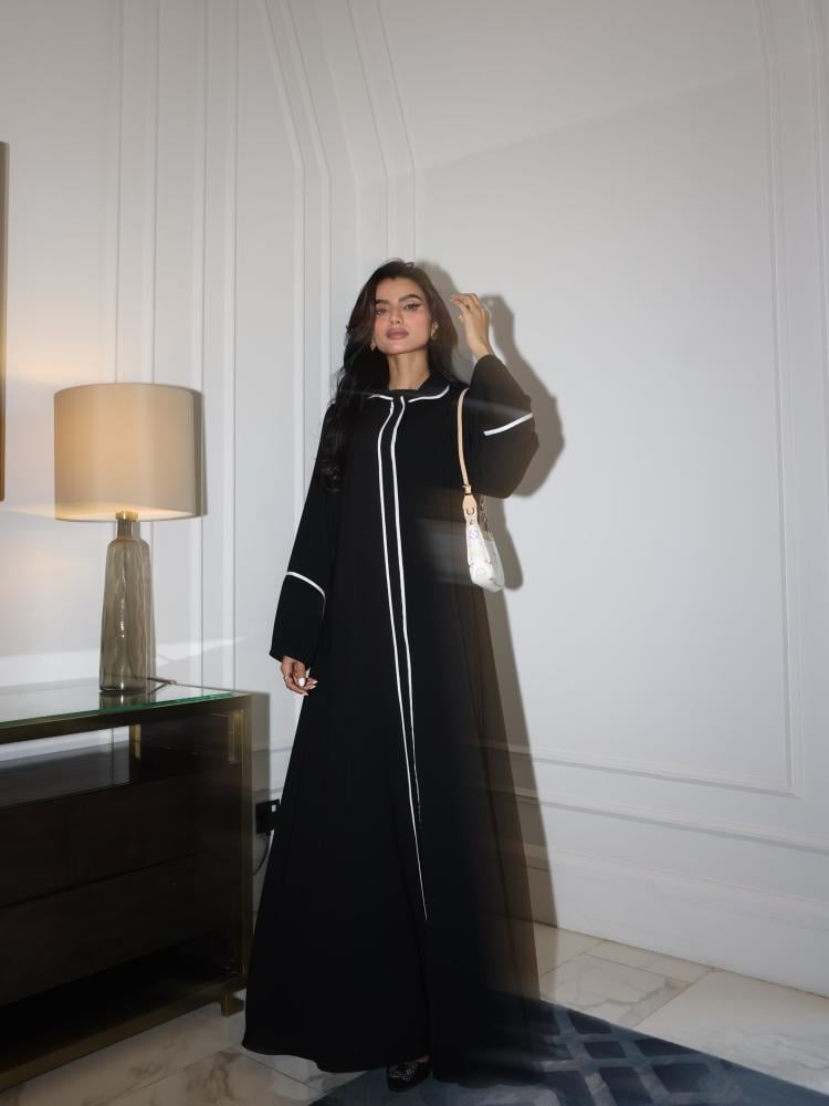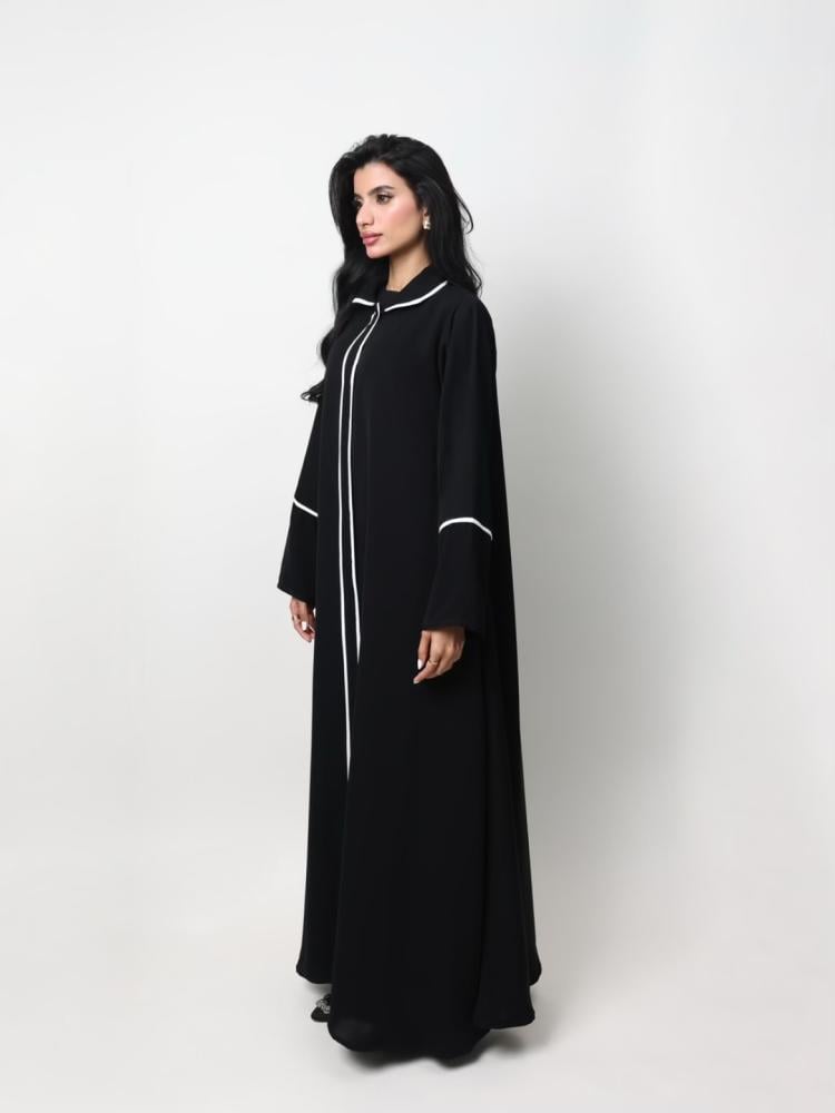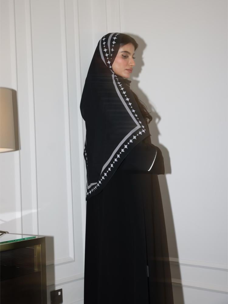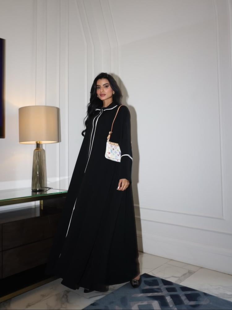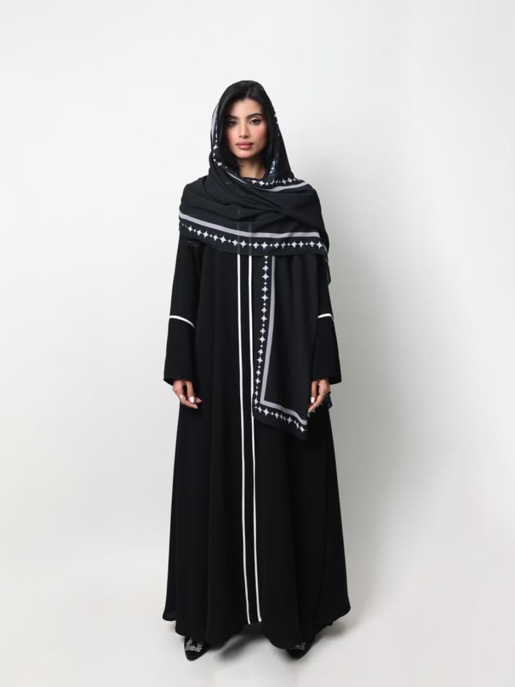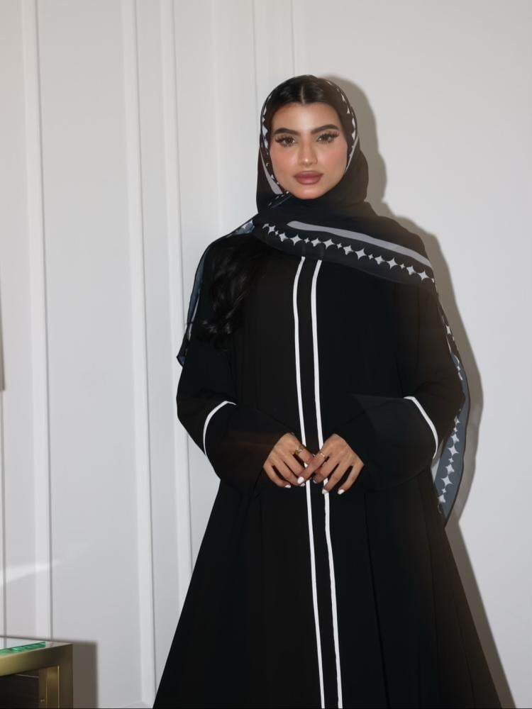 التفاصيل: قماش كريب كوري اسود صيفي مع اطراف أبيض ، طرحة طباعة خاصة بالهنوف عباية بدون طباعة لوقو